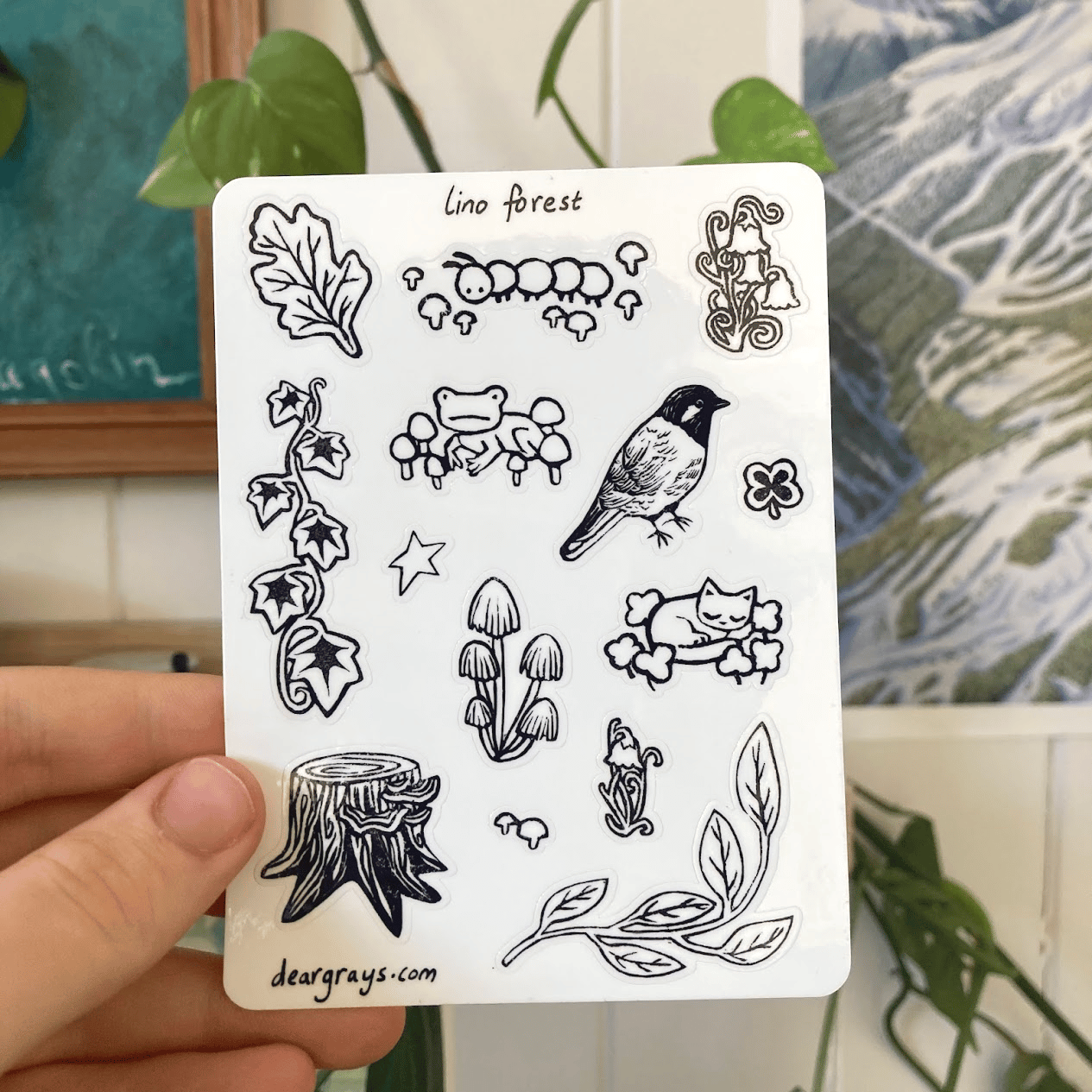 a 3.5 x 4.6 inch (small!) black and white sticker sheet, made from various lino stamps i've made throughout the years! the sheet is waterproof with a glossy finish, and the stickers themselves are very small so they're perfect for journals or filling the gaps between larger stickers!