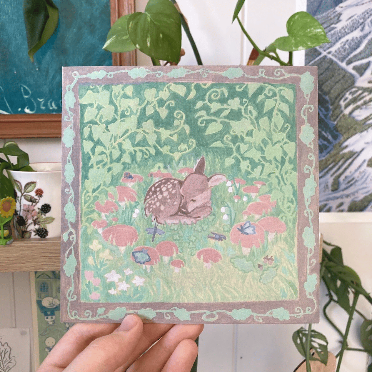 little fawn in fairy ring - square art print/postcard illustration