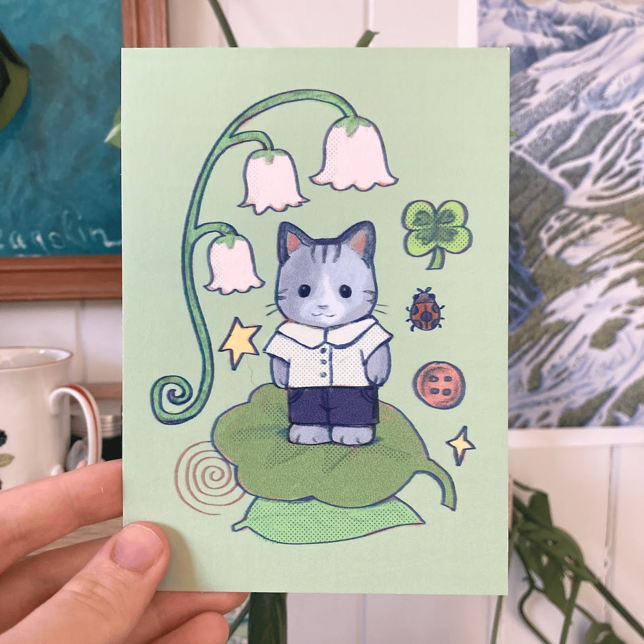 an a6 art print/postcard, printed on 300gsm (quite sturdy) paper. design based on sylvanian familes (or calico critters)! I also have this design available as a waterproof vinyl sticker, under the "stickers" section of my storefront :-)